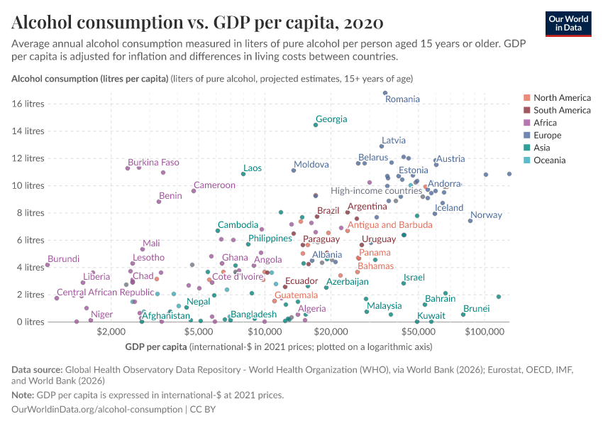 In the chart, we see the relationship between average per capita alcohol consumption – in liters of pure alcohol per year – versus gross domestic product (GDP) per capita across countries.