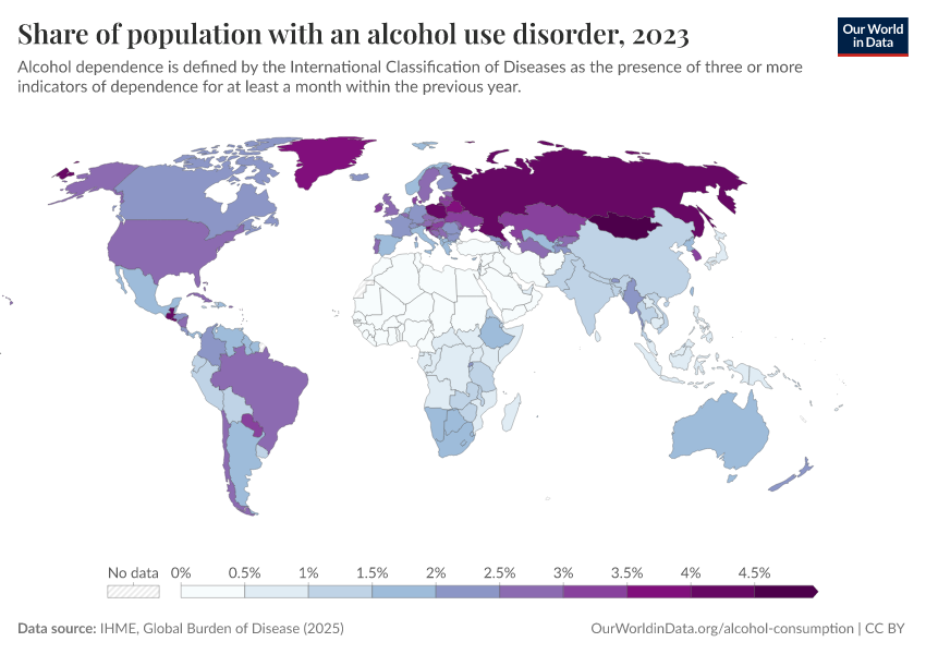 This interactive map shows the share of adults who drink alcohol. This is given as the share of adults aged 15 years and older who have drunk alcohol within the previous year.