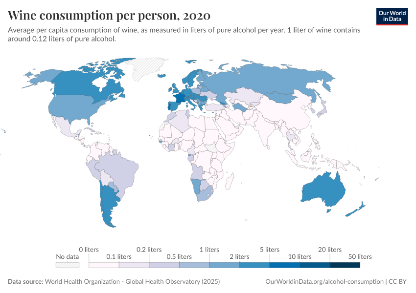 To make this average more understandable, we can express it in bottles of wine. Wine contains around 12% pure alcohol per volume1 so that one liter of wine contains 0.12 liters of pure alcohol. So, a value of 6 liters of pure alcohol per person per year is equivalent to 50 liters of wine. Or, 67 standard bottles of wine (which have a volume of 0.75 liters).