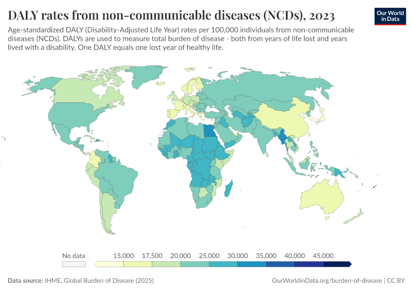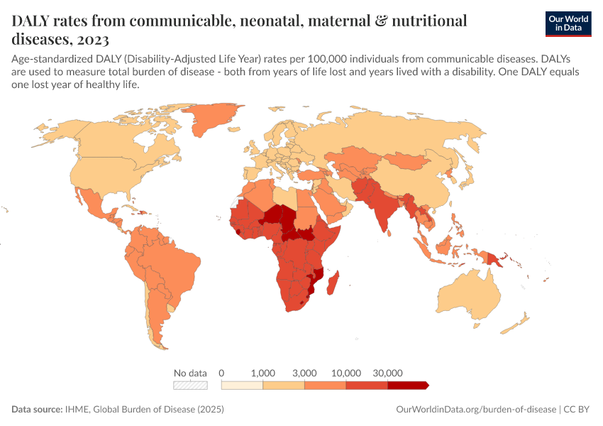 This map shows the annual rate of DALYs per 100,000 people in the population. It is thereby measuring the distribution of the burden of both mortality and morbidity around the world.
