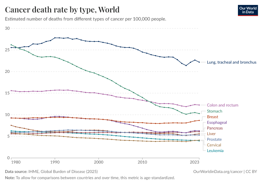 As the global population grows larger and older, the number of cancer cases has also increased. However, the age-standardized death rate from cancer has declined over time in many countries — due to improvements in diagnosis, research, medical advances, and public health efforts, as well as reductions in risk factors such as smoking and some cancer-causing pathogens.