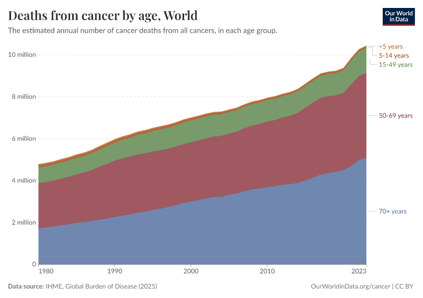 The world has seen a rise in cancer deaths over time, as the chart below shows. This comes largely from more deaths in the oldest age groups as populations have been growing and aging.