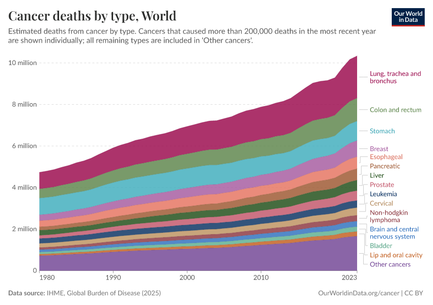 The share of cancer deaths from each type varies between countries. You can explore an interactive chart for different countries showing the relative share of all cancer deaths from each cancer type here: