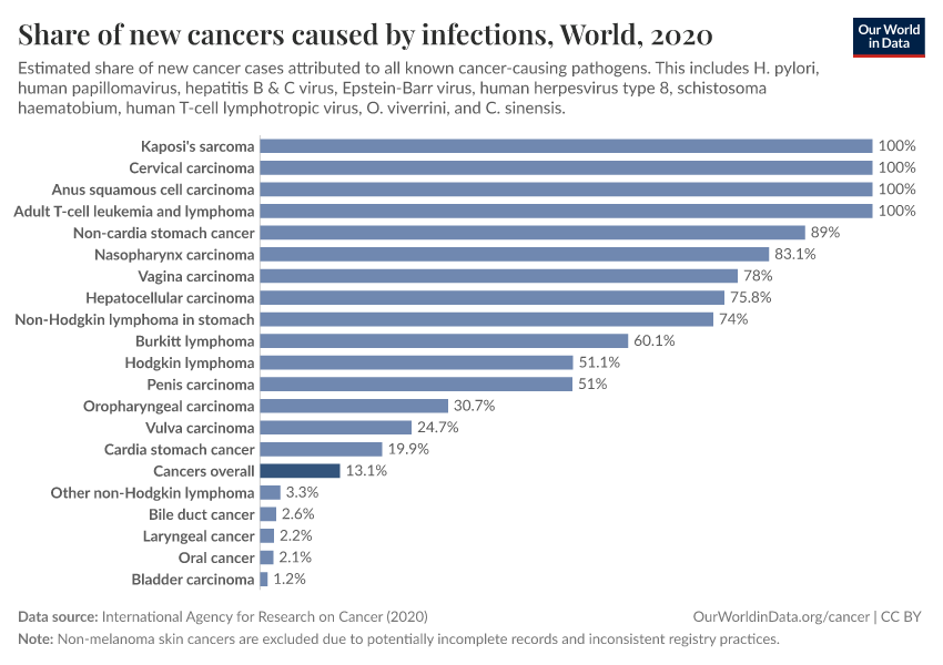 You can see that, for some cancers — such as Kaposi’s sarcoma, cervical cancer, T-cell leukemia and lymphoma, and non-cardia stomach cancer — it’s estimated that all, or almost all, cases are caused by pathogens.