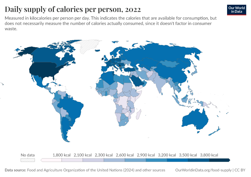 Max Roser, Hannah Ritchie, and Pablo Rosado (2013) - “Food Supply” Published online at OurWorldinData.org. Retrieved from: 'https://drop-density-mdim.owid.pages.dev/food-supply' [Online Resource]BibTeX citation