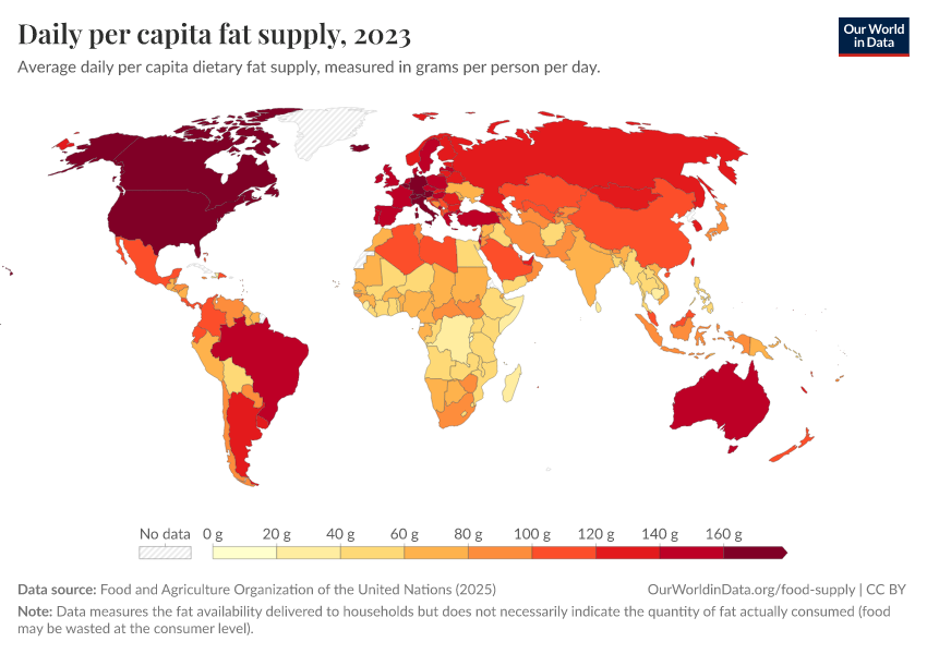 In this interactive map, we see the differences in how much fat each person gets every day in different countries.