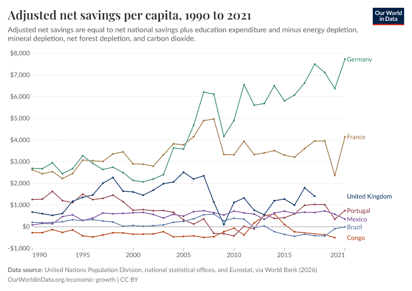 “Data Page: Adjusted net savings per capita”. Our World in Data (2026). Data adapted from United Nations Population Division, national statistical offices, and Eurostat, via World Bank. Retrieved from https://drop-density-mdim.owid.pages.dev:8789/20260202-181317/grapher/adjusted-net-savings-per-person.html [online resource] (archived on February 2, 2026).How to cite this data