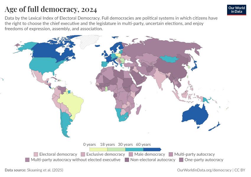 Skaaning et al. (2025) – processed by Our World in Data. “Age of full democracy” [dataset]. Skaaning et al., “Lexical Index of Electoral Democracy (LIED) v6.8” [original data]. Retrieved February 25, 2026 from https://drop-density-mdim.owid.pages.dev:8789/20260119-065148/grapher/age-of-full-democracy.html (archived on January 19, 2026).