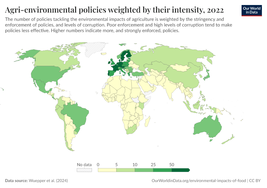 Wuepper et al. (2024) – processed by Our World in Data. “Agri-environmental policies weighted by their intensity” [dataset]. Wuepper et al. (2024), “agricultural_policies_wuepper” [original data]. Retrieved February 25, 2026 from https://drop-density-mdim.owid.pages.dev:8789/20250909-093708/grapher/agri-environmental-policies-intensity.html (archived on September 9, 2025).