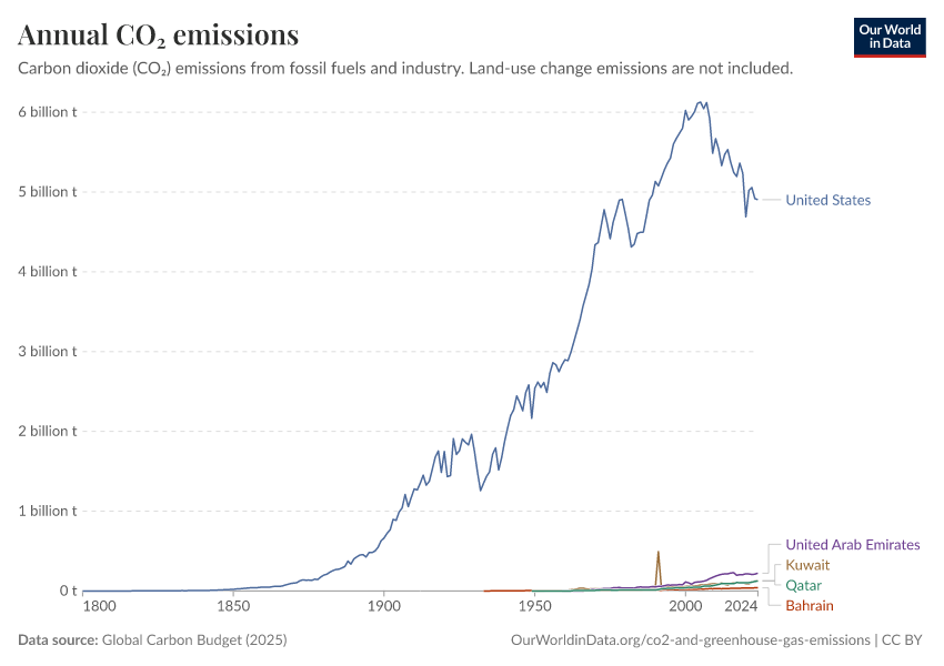 Global Carbon Budget (2025) – with major processing by Our World in Data. “Annual CO₂ emissions” [dataset]. Global Carbon Project, “Global Carbon Budget v15” [original data]. Retrieved February 25, 2026 from https://drop-density-mdim.owid.pages.dev:8789/20260223-071105/grapher/annual-co2-emissions-per-country.html (archived on February 23, 2026).