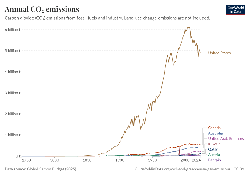 Global Carbon Budget (2025) – with major processing by Our World in Data. “Annual CO₂ emissions” [dataset]. Global Carbon Project, “Global Carbon Budget v15” [original data]. Retrieved February 25, 2026 from https://drop-density-mdim.owid.pages.dev:8789/20260223-071105/grapher/annual-co2-emissions-per-country.html (archived on February 23, 2026).