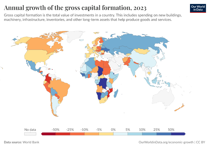 World Bank – processed by Our World in Data. “Annual growth of the gross capital formation” [dataset]. World Bank, “World Bank national accounts data, and OECD National Accounts data files.” [original data]. Retrieved February 25, 2026 from https://drop-density-mdim.owid.pages.dev:8789/20260130-180113/grapher/annual-growth-of-the-gross-capital-formation.html (archived on January 30, 2026).