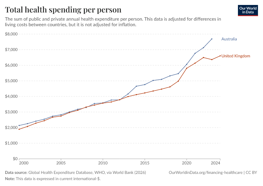 “Data Page: Total health spending per person”. Our World in Data (2026). Data adapted from Global Health Expenditure Database, WHO, via World Bank. Retrieved from https://drop-density-mdim.owid.pages.dev:8789/20260202-180243/grapher/annual-healthcare-expenditure-per-capita.html [online resource] (archived on February 2, 2026).