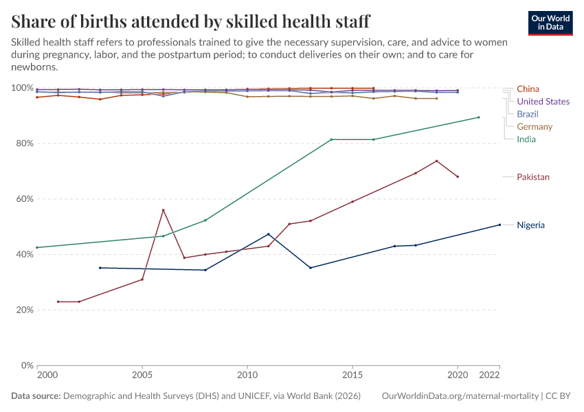 “Data Page: Share of births attended by skilled health staff”. Our World in Data (2026). Data adapted from Demographic and Health Surveys (DHS) and UNICEF, via World Bank. Retrieved from https://drop-density-mdim.owid.pages.dev:8789/20260202-181317/grapher/births-attended-by-health-staff-sdgs.html [online resource] (archived on February 2, 2026).