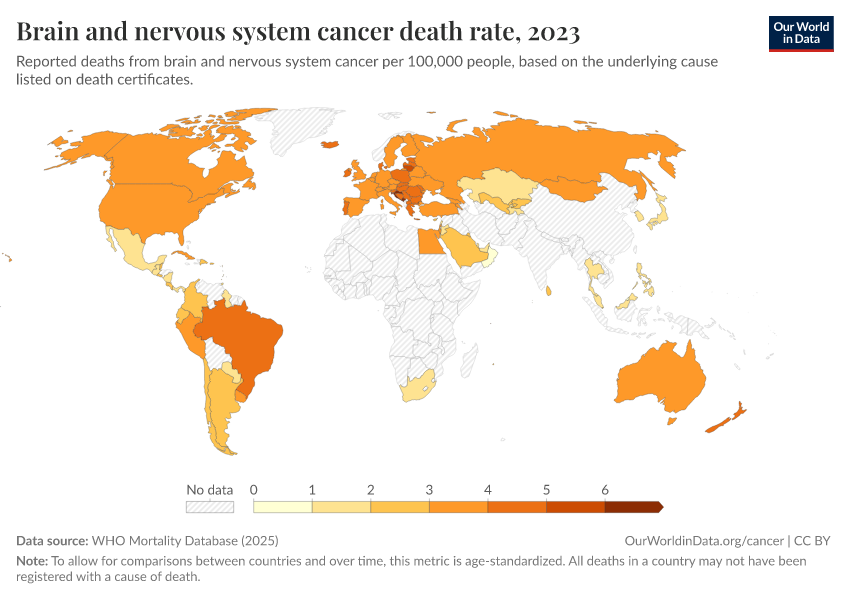 WHO Mortality Database (2025) – with minor processing by Our World in Data. “Brain and nervous system cancer death rate” [dataset]. WHO Mortality Database, “WHO Mortality Database” [original data]. Retrieved February 25, 2026 from https://drop-density-mdim.owid.pages.dev:8789/20250909-093708/grapher/brain-and-nervous-system-cancer-death-rate.html (archived on September 9, 2025).