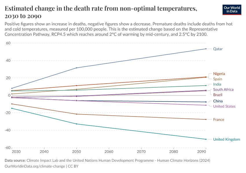 “Data Page: Estimated change in the death rate from non-optimal temperatures”. Our World in Data (2026). Data adapted from Climate Impact Lab and the United Nations Human Development Programme. Retrieved from https://drop-density-mdim.owid.pages.dev:8789/20250909-093708/grapher/change-heat-death-rate.html [online resource] (archived on September 9, 2025).How to cite this data