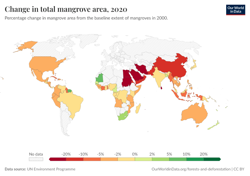 “Data Page: Change in total mangrove area”. Our World in Data (2026). Data adapted from UN Environment Programme. Retrieved from https://drop-density-mdim.owid.pages.dev:8789/20260130-180113/grapher/change-in-total-mangrove-area.html [online resource] (archived on January 30, 2026).How to cite this data