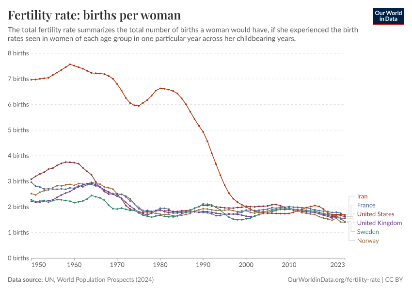 “Data Page: Fertility rate, total”. Our World in Data (2026). Data adapted from United Nations. Retrieved from https://drop-density-mdim.owid.pages.dev:8789/20260225-004721/grapher/children-per-woman-un.html [online resource] (archived on February 25, 2026).