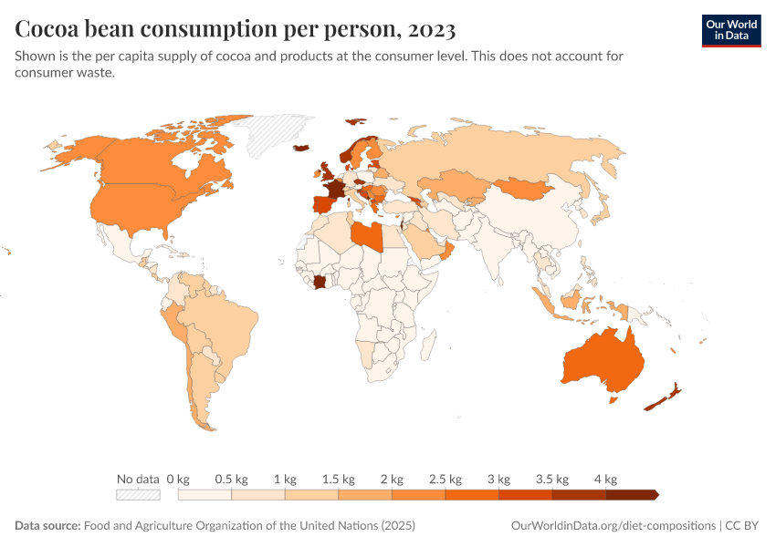 “Data Page: Yearly per capita supply of cocoa beans”. Our World in Data (2026). Data adapted from Food and Agriculture Organization of the United Nations. Retrieved from https://drop-density-mdim.owid.pages.dev:8789/20260225-014904/grapher/chocolate-consumption-per-person.html [online resource] (archived on February 25, 2026).How to cite this data