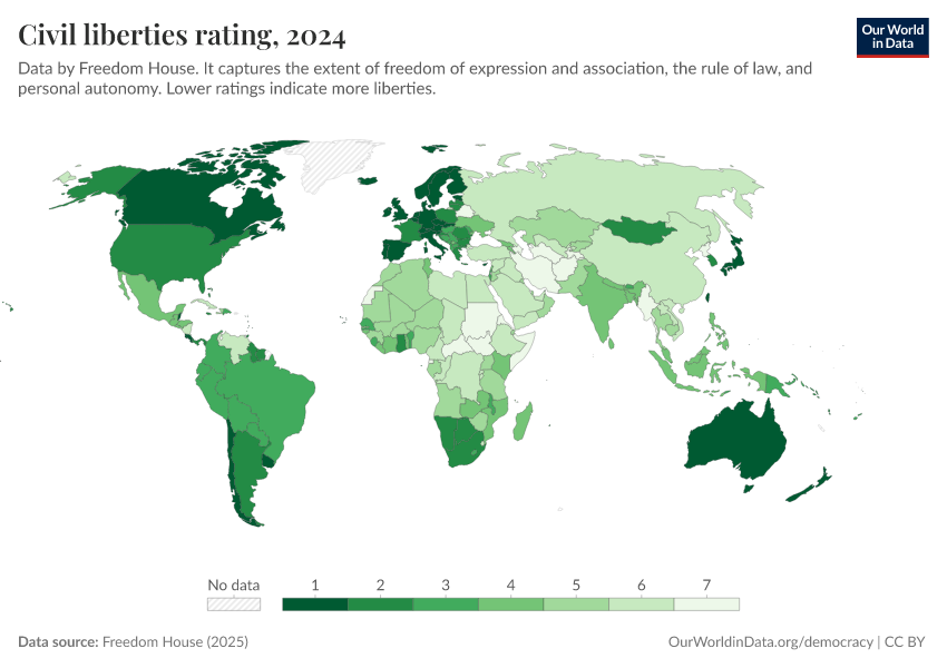 Freedom House (2025) – processed by Our World in Data. “Civil liberties rating” [dataset]. Freedom House, “Freedom in the World” [original data]. Retrieved February 25, 2026 from https://drop-density-mdim.owid.pages.dev:8789/20260119-070102/grapher/civil-liberties-rating-fh.html (archived on January 19, 2026).