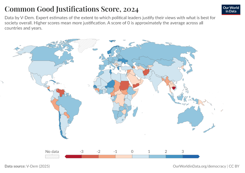 “Data Page: Common good justifications”, part of the following publication: Bastian Herre, Lucas Rodés-Guirao, and Esteban Ortiz-Ospina (2013) - “Democracy”. Data adapted from V-Dem. Retrieved from https://drop-density-mdim.owid.pages.dev:8789/20260204-170225/grapher/common-good-justifications-score.html [online resource] (archived on February 4, 2026).How to cite this data