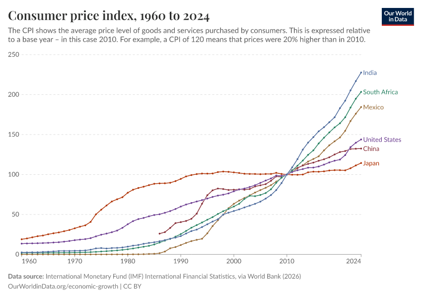 International Monetary Fund (IMF) International Financial Statistics, via World Bank (2026) – processed by Our World in Data. “Consumer price index” [dataset]. International Monetary Fund (IMF) International Financial Statistics, via World Bank, “World Development Indicators 125” [original data]. Retrieved February 25, 2026 from https://drop-density-mdim.owid.pages.dev:8789/20260202-181317/grapher/consumer-price-index.html (archived on February 2, 2026).