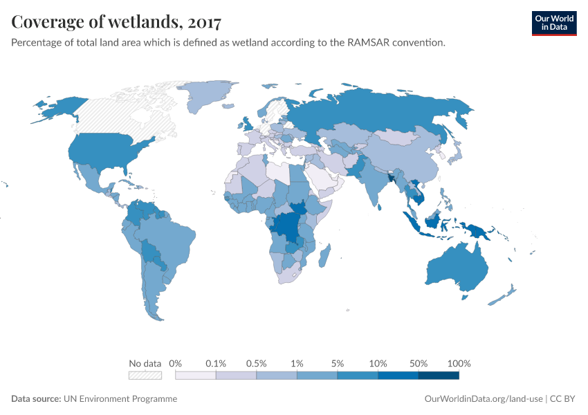“Data Page: Coverage of wetlands”. Our World in Data (2026). Data adapted from UN Environment Programme. Retrieved from https://drop-density-mdim.owid.pages.dev:8789/20260130-180113/grapher/coverage-of-wetlands.html [online resource] (archived on January 30, 2026).How to cite this data