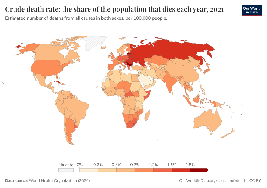 World Health Organization (2024) – with major processing by Our World in Data. “Crude death rate: the share of the population that dies each year” [dataset]. World Health Organization, “Global Health Estimates” [original data]. Retrieved February 25, 2026 from https://drop-density-mdim.owid.pages.dev:8789/20250909-093708/grapher/crude-death-rate-the-share-of-the-population-that-dies-each-year-who.html (archived on September 9, 2025).