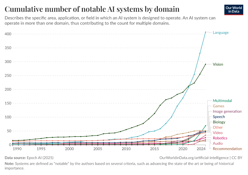 Epoch AI (2025) – with major processing by Our World in Data. “Cumulative number of notable AI systems by domain” [dataset]. Epoch AI, “Parameter, Compute and Data Trends in Machine Learning” [original data]. Retrieved February 25, 2026 from https://drop-density-mdim.owid.pages.dev:8789/20260126-094752/grapher/cumulative-number-of-notable-ai-systems-by-domain.html (archived on January 26, 2026).