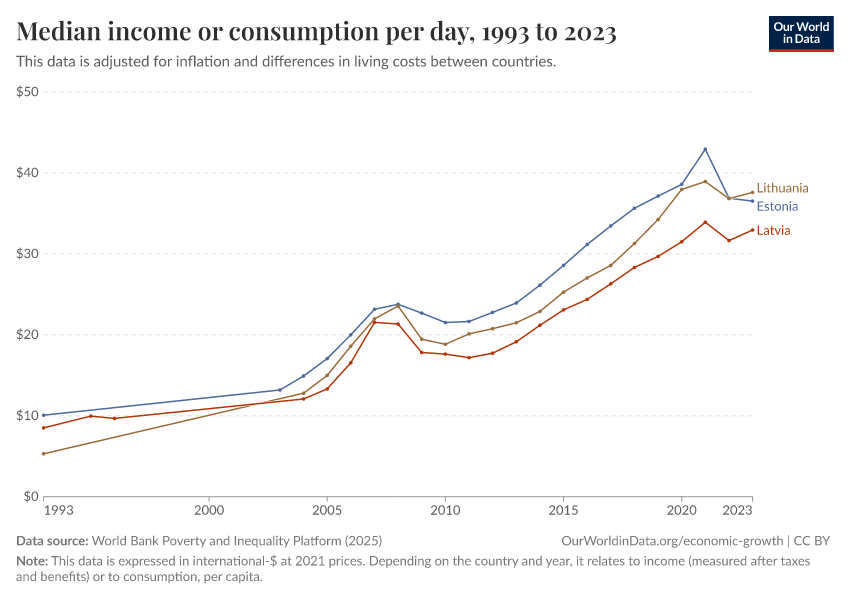 “Data Page: Median income or consumption per day”, part of the following publication: Joe Hasell, Bertha Rohenkohl, Pablo Arriagada, Esteban Ortiz-Ospina, and Max Roser (2022) - “Poverty”. Data adapted from World Bank Poverty and Inequality Platform. Retrieved from https://drop-density-mdim.owid.pages.dev:8789/20260127-114142/grapher/daily-median-income.html [online resource] (archived on January 27, 2026).How to cite this data