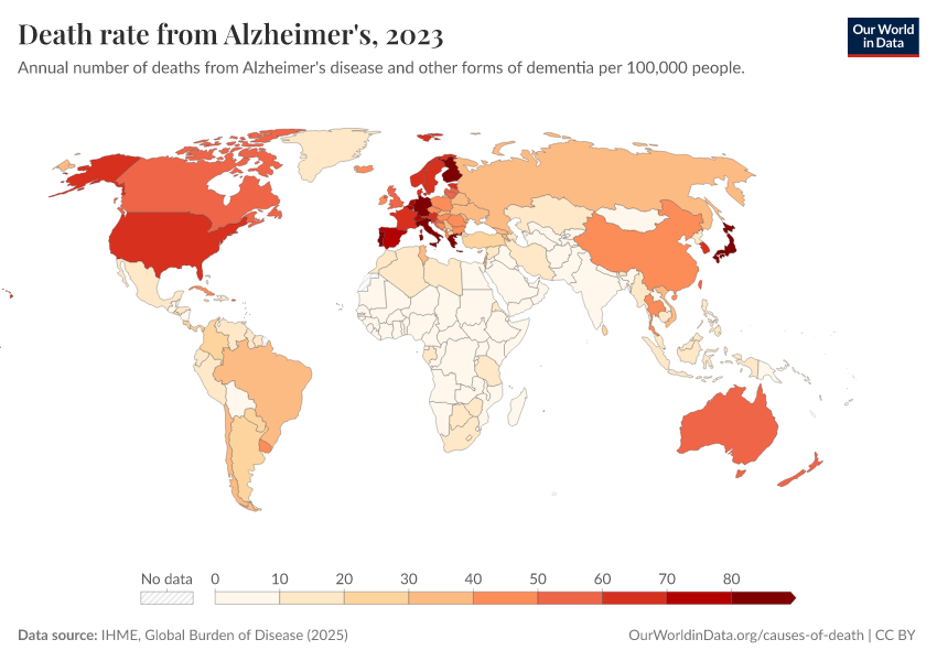 “Data Page: Death rate from Alzheimer's”, part of the following publication: Esteban Ortiz-Ospina and Max Roser (2016) - “Global Health”. Data adapted from IHME, Global Burden of Disease. Retrieved from https://drop-density-mdim.owid.pages.dev:8789/20260211-174736/grapher/death-rate-from-alzheimers-other-dementias-gbd.html [online resource] (archived on February 11, 2026).How to cite this data