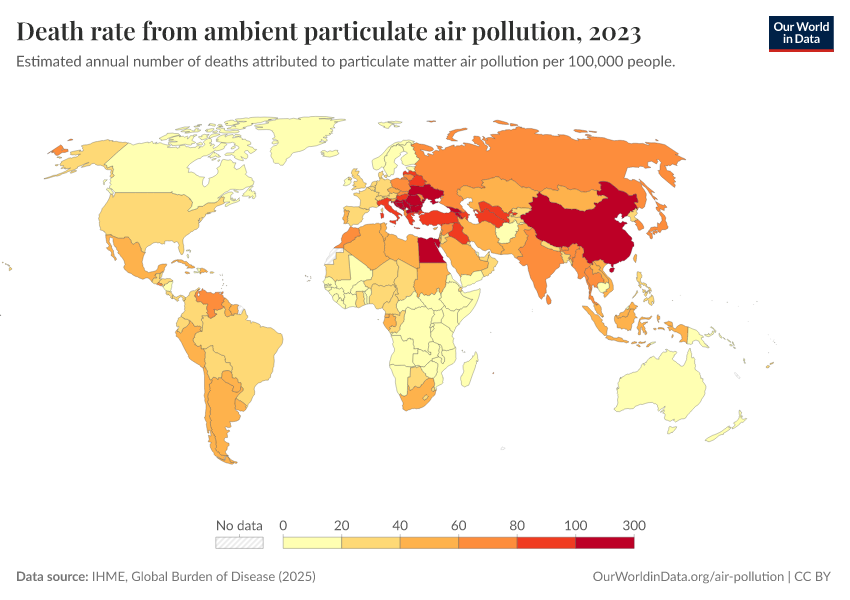 IHME, Global Burden of Disease (2025) – with major processing by Our World in Data. “Death rate from ambient particulate air pollution” [dataset]. IHME, Global Burden of Disease, “Global Burden of Disease - Risk Factors - Deaths” [original data]. Retrieved February 25, 2026 from https://drop-density-mdim.owid.pages.dev:8789/20260213-112438/grapher/death-rate-from-ambient-particulate-air-pollution.html (archived on February 13, 2026).
