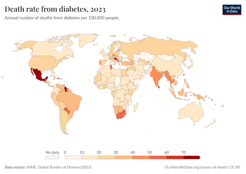 “Data Page: Death rate from diabetes”, part of the following publication: Esteban Ortiz-Ospina and Max Roser (2016) - “Global Health”. Data adapted from IHME, Global Burden of Disease. Retrieved from https://drop-density-mdim.owid.pages.dev:8789/20260211-174736/grapher/death-rate-from-diabetes-gbd.html [online resource] (archived on February 11, 2026).How to cite this data