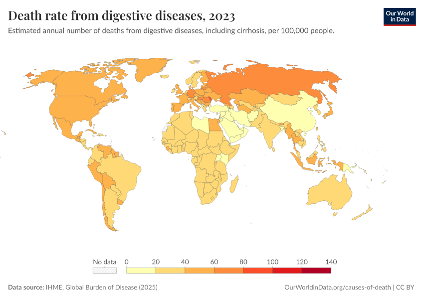 IHME, Global Burden of Disease (2025) – with major processing by Our World in Data. “Death rate from digestive diseases” [dataset]. IHME, Global Burden of Disease, “Global Burden of Disease - Deaths” [original data]. Retrieved February 25, 2026 from https://drop-density-mdim.owid.pages.dev:8789/20260211-174736/grapher/death-rate-from-digestive-diseases-gbd.html (archived on February 11, 2026).