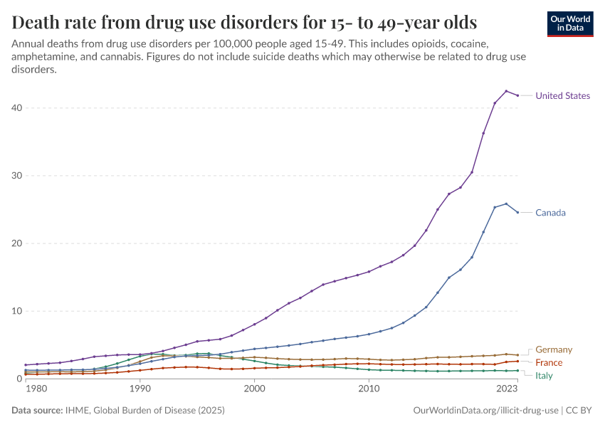 IHME, Global Burden of Disease (2025) – with major processing by Our World in Data. “Death rate from drug use disorders for 15- to 49-year olds” [dataset]. IHME, Global Burden of Disease, “Global Burden of Disease - Deaths” [original data]. Retrieved February 25, 2026 from https://drop-density-mdim.owid.pages.dev:8789/20260211-174736/grapher/death-rate-from-drug-use-disorders-for-15--to-49-year-olds.html (archived on February 11, 2026).