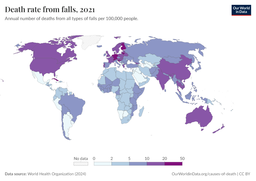 World Health Organization (2024) – with major processing by Our World in Data. “Death rate from falls” [dataset]. World Health Organization, “Global Health Estimates” [original data]. Retrieved February 25, 2026 from https://drop-density-mdim.owid.pages.dev:8789/20250909-093708/grapher/death-rate-from-falls.html (archived on September 9, 2025).