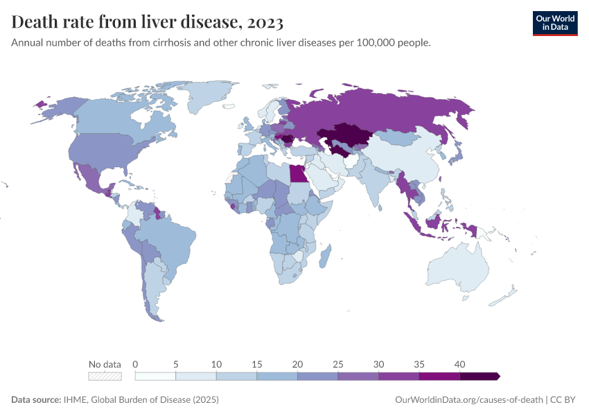 IHME, Global Burden of Disease (2025) – with major processing by Our World in Data. “Death rate from liver disease” [dataset]. IHME, Global Burden of Disease, “Global Burden of Disease - Deaths” [original data]. Retrieved February 25, 2026 from https://drop-density-mdim.owid.pages.dev:8789/20260211-174736/grapher/death-rate-from-liver-disease-gbd.html (archived on February 11, 2026).