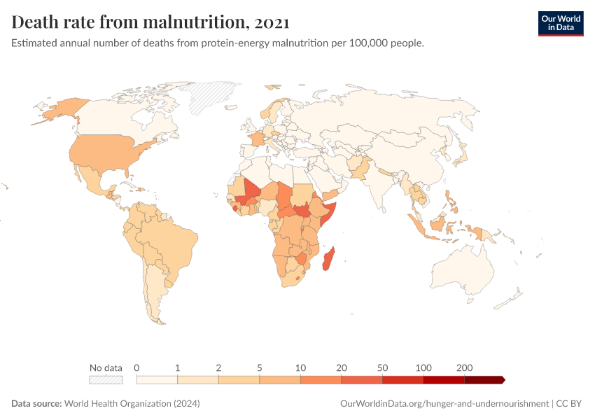 World Health Organization (2024) – with major processing by Our World in Data. “Death rate from malnutrition” [dataset]. World Health Organization, “Global Health Estimates” [original data]. Retrieved February 25, 2026 from https://drop-density-mdim.owid.pages.dev:8789/20250909-093708/grapher/death-rate-from-malnutrition-ghe.html (archived on September 9, 2025).