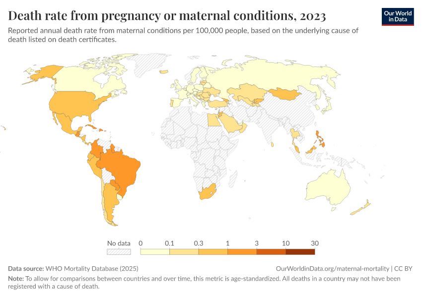 WHO Mortality Database (2025) – with minor processing by Our World in Data. “Death rate from pregnancy or maternal conditions” [dataset]. WHO Mortality Database, “WHO Mortality Database” [original data]. Retrieved February 25, 2026 from https://drop-density-mdim.owid.pages.dev:8789/20250909-093708/grapher/death-rate-from-maternal-disorders.html (archived on September 9, 2025).