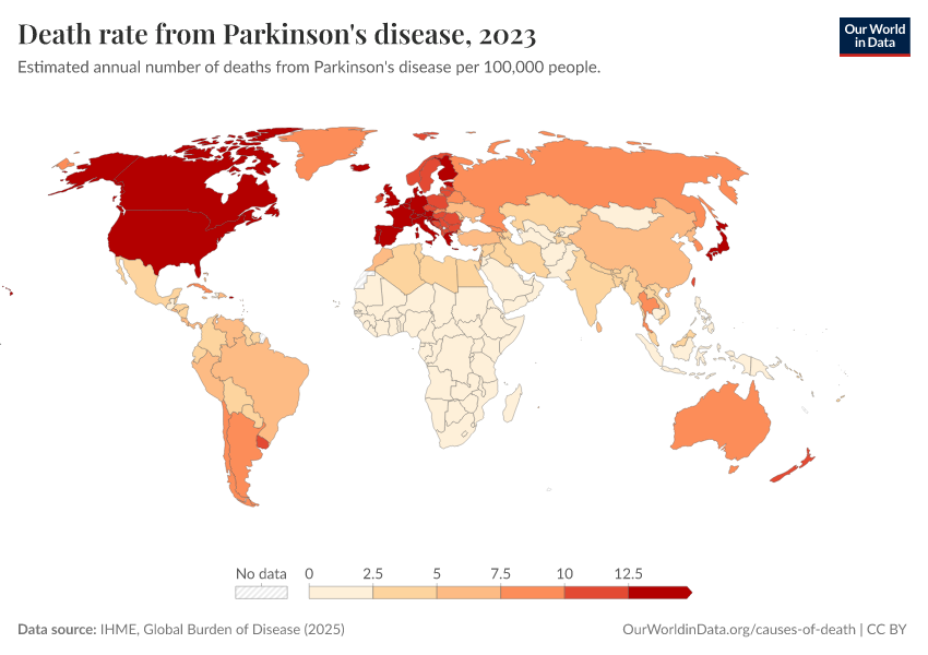 IHME, Global Burden of Disease (2025) – with major processing by Our World in Data. “Death rate from Parkinson's disease” [dataset]. IHME, Global Burden of Disease, “Global Burden of Disease - Deaths” [original data]. Retrieved February 25, 2026 from https://drop-density-mdim.owid.pages.dev:8789/20260211-174736/grapher/death-rate-from-parkinsons-disease-gbd.html (archived on February 11, 2026).