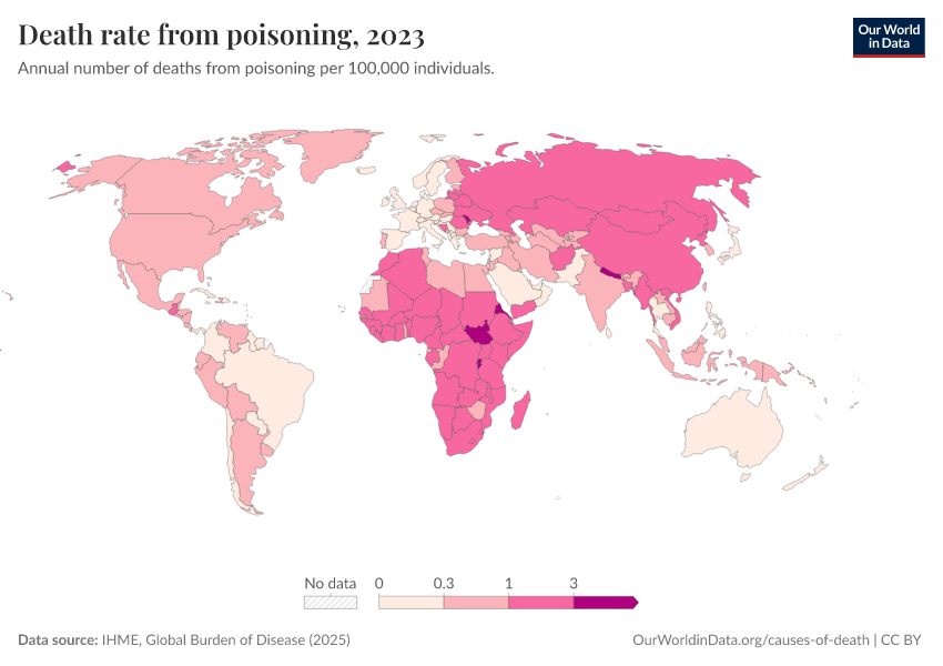 IHME, Global Burden of Disease (2025) – with major processing by Our World in Data. “Death rate from poisoning” [dataset]. IHME, Global Burden of Disease, “Global Burden of Disease - Deaths” [original data]. Retrieved February 25, 2026 from https://drop-density-mdim.owid.pages.dev:8789/20260211-174736/grapher/death-rate-from-poisoning-gbd.html (archived on February 11, 2026).