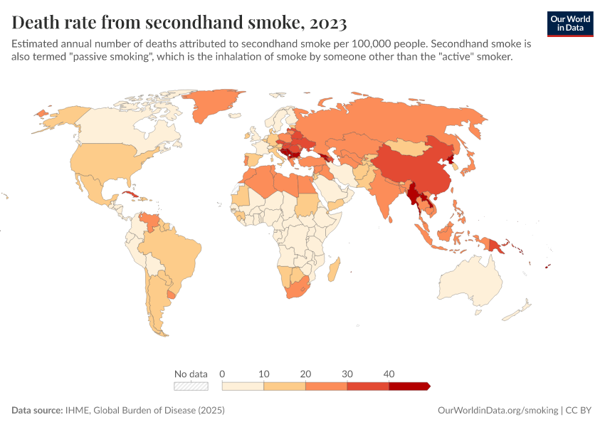 “Data Page: Death rate from secondhand smoke”, part of the following publication: Esteban Ortiz-Ospina and Max Roser (2016) - “Global Health”. Data adapted from IHME, Global Burden of Disease. Retrieved from https://drop-density-mdim.owid.pages.dev:8789/20260213-113303/grapher/death-rate-from-secondhand-smoke-gbd.html [online resource] (archived on February 13, 2026).How to cite this data