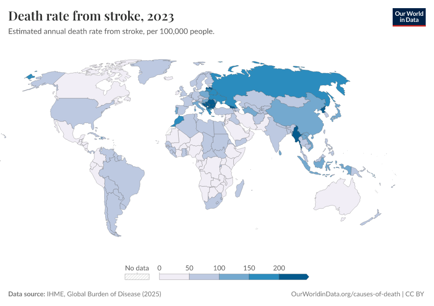 IHME, Global Burden of Disease (2025) – with major processing by Our World in Data. “Death rate from stroke” [dataset]. IHME, Global Burden of Disease, “Global Burden of Disease - Deaths” [original data]. Retrieved February 25, 2026 from https://drop-density-mdim.owid.pages.dev:8789/20260211-174736/grapher/death-rate-from-strokes.html (archived on February 11, 2026).