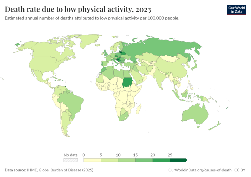 “Data Page: Death rate due to low physical activity”, part of the following publication: Esteban Ortiz-Ospina and Max Roser (2016) - “Global Health”. Data adapted from IHME, Global Burden of Disease. Retrieved from https://drop-density-mdim.owid.pages.dev:8789/20260213-112438/grapher/death-rates-due-to-low-physical-activity-gbd.html [online resource] (archived on February 13, 2026).How to cite this data