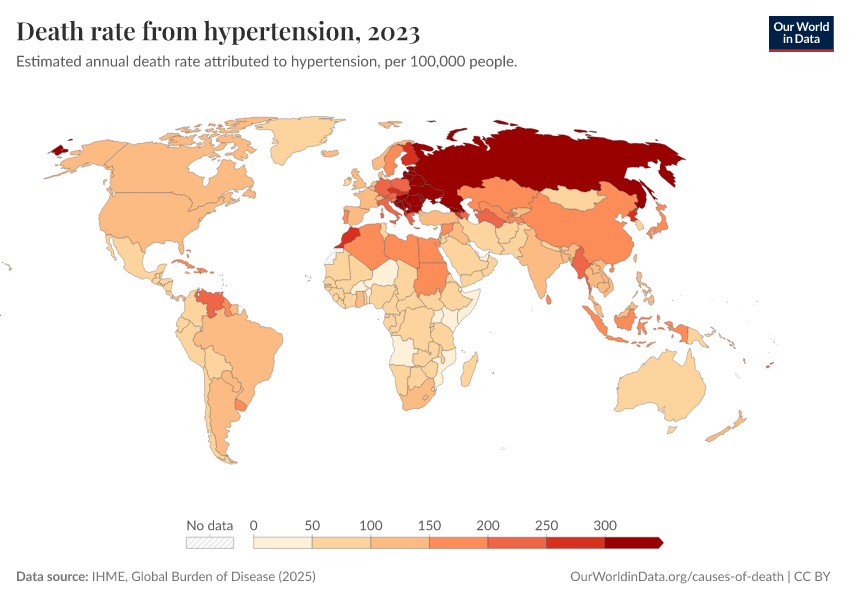 IHME, Global Burden of Disease (2025) – with major processing by Our World in Data. “Death rate from hypertension” [dataset]. IHME, Global Burden of Disease, “Global Burden of Disease - Risk Factors - Deaths” [original data]. Retrieved February 25, 2026 from https://drop-density-mdim.owid.pages.dev:8789/20260213-112438/grapher/death-rates-from-high-blood-pressure-gbd.html (archived on February 13, 2026).
