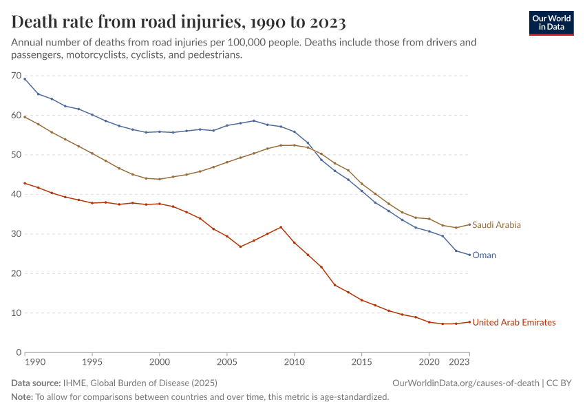 “Data Page: Death rate from road injuries”, part of the following publication: Esteban Ortiz-Ospina and Max Roser (2016) - “Global Health”. Data adapted from IHME, Global Burden of Disease. Retrieved from https://drop-density-mdim.owid.pages.dev:8789/20260211-173942/grapher/death-rates-road-incidents.html [online resource] (archived on February 11, 2026).