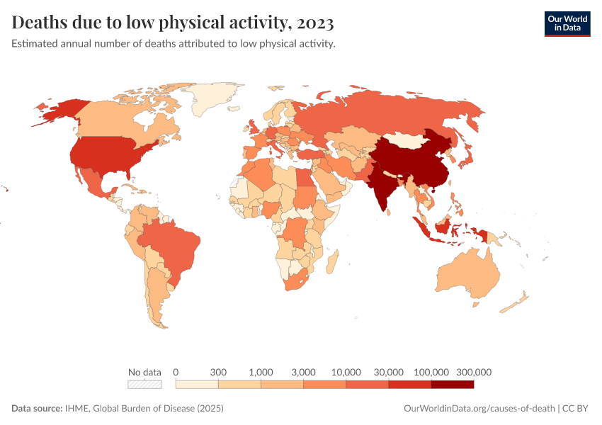 “Data Page: Deaths due to low physical activity”, part of the following publication: Esteban Ortiz-Ospina and Max Roser (2016) - “Global Health”. Data adapted from IHME, Global Burden of Disease. Retrieved from https://drop-density-mdim.owid.pages.dev:8789/20260213-112438/grapher/deaths-due-to-low-physical-activity.html [online resource] (archived on February 13, 2026).How to cite this data