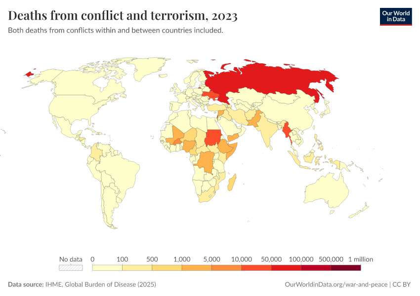 “Data Page: Deaths from conflict and terrorism”, part of the following publication: Esteban Ortiz-Ospina and Max Roser (2016) - “Global Health”. Data adapted from IHME, Global Burden of Disease. Retrieved from https://drop-density-mdim.owid.pages.dev:8789/20260211-174736/grapher/deaths-from-conflict-and-terrorism.html [online resource] (archived on February 11, 2026).How to cite this data