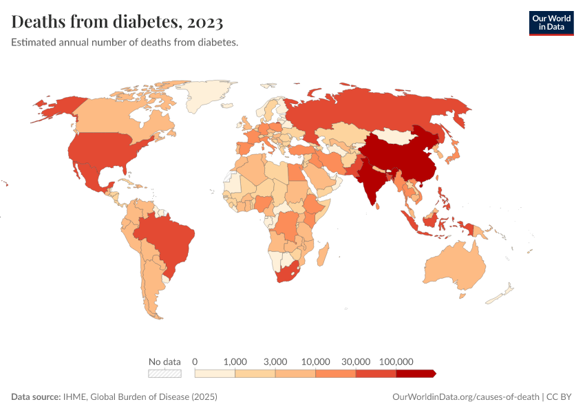 “Data Page: Deaths from diabetes”, part of the following publication: Esteban Ortiz-Ospina and Max Roser (2016) - “Global Health”. Data adapted from IHME, Global Burden of Disease. Retrieved from https://drop-density-mdim.owid.pages.dev:8789/20260211-174736/grapher/deaths-from-diabetes.html [online resource] (archived on February 11, 2026).How to cite this data