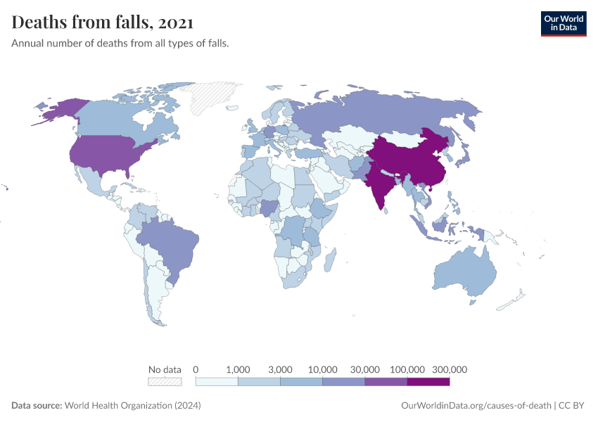 “Data Page: Deaths from falls”, part of the following publication: Esteban Ortiz-Ospina and Max Roser (2016) - “Global Health”. Data adapted from World Health Organization. Retrieved from https://drop-density-mdim.owid.pages.dev:8789/20250909-093708/grapher/deaths-from-falls.html [online resource] (archived on September 9, 2025).How to cite this data